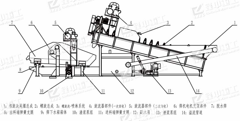 組成:螺旋洗砂裝置,溢流裝置、反水裝置,尾礦干排裝置,分離回收裝置,儲水槽,水泵,電機,減速機。