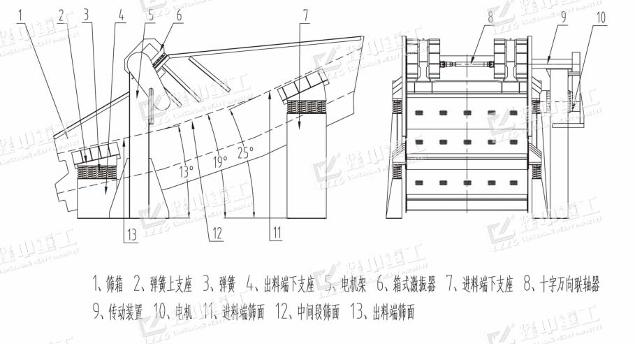 1、應用等厚篩分原理,針對不同的物料特性,采用不同的振動參數、分段數量及篩面傾角,篩面傾角過度平緩,篩面分段數量4~7段,能夠保篩分效果。同時平緩的傾角過度和較多的分段數量有利于篩面壽命提高。