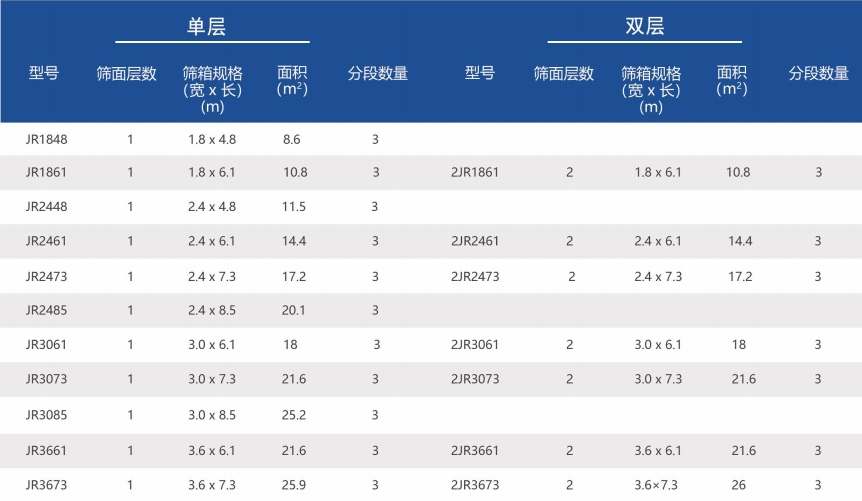 該系列根據篩機不同用途及處理量大小,采用不同的篩分面積、篩縫尺寸、篩面分段數量以及篩面傾角,分單層和雙層產品,工作面積5.7m2~30.2m2,共20種主要規格型號,可基本滿足各種類型礦井和選煤廠生產需要。